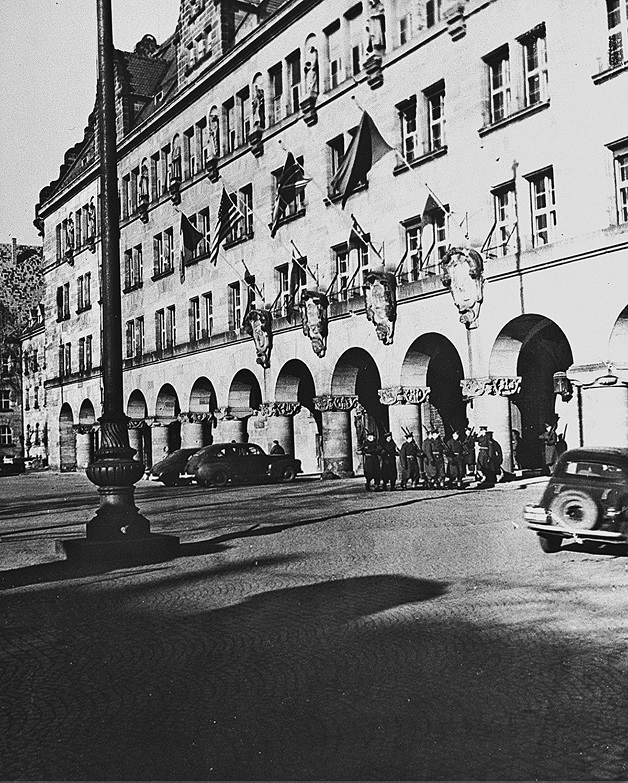 Оставив багаж в пресс-лагере, расположенном к юго-западу от города, Кармен направился прямо в суд. Он спешил. Из-за плохой погоды задержался его рейс в Нюрнберг. Было уже 22 ноября: он пропустил первые два дня процесса и не хотел больше терять времени. Его машина свернула на Фюртерштрассе, одну из немногих улиц, сохранивших свой вид. Там за коваными железными воротами стоял Дворец юстиции. Четырехэтажное здание начала XX века выглядело сравнительно не тронутым войной. Тысячи немецких военнопленных были подряжены американскими оккупационными войсками заделывать дыры от пуль и ремонтировать здание. При виде советского почетного караула Кармен ощутил прилив гордости, вспомнив «доблестный путь» Красной армии «от Сталинграда, Волги, Москвы до Берлина»[2].