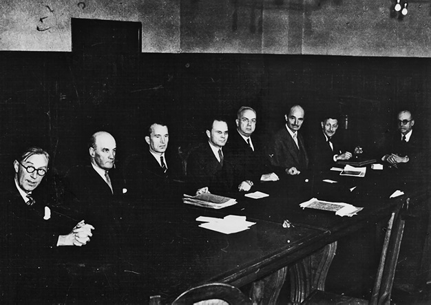 Ил. 14. Четверо судей и их заместители ненадолго встретились в Нюрнберге 19 октября 1945 года. Слева направо: британский судья-заместитель Норман Биркетт, британский судья (и председатель Трибунала) Джеффри Лоуренс, советский судья-заместитель Александр Волчков, советский судья Иона Никитченко, американский судья-заместитель Джон Паркер, американский судья Фрэнсис Биддл, французский судья-заместитель Робер Фалько, французский судья Анри Доннедье де Вабр. Никитченко и Фалько участвовали в прениях Лондонской конференции до того, как пересели в судейские кресла. Источник: Государственный архив Российской Федерации (ГАРФ). Ф. 10140. Оп. 2. Д. 152. Л. 1. Фотограф: Виктор Тёмин