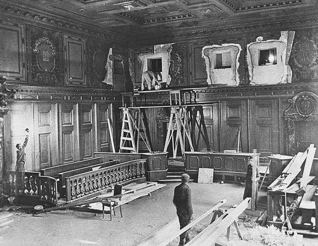 Ил. 15. В стене зала суда проделывают окна для радиокомментаторов, фотографов и кинооператоров. Сентябрь 1945 года. Подготовка зала суда длилась большую часть осени. Источник: Американский мемориальный музей Холокоста. Предоставлено Национальной администрацией архивов и записей, Колледж-Парк