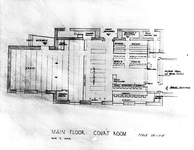 Ил. 16. Американский набросок плана первого этажа зала суда в Нюрнберге. 7 ноября 1945 года. На плане показаны места для прессы, но не галерея для зрителей, которая располагалась на втором этаже. Источник: Американский мемориальный музей Холокоста. Предоставлено Рэнди Коулом