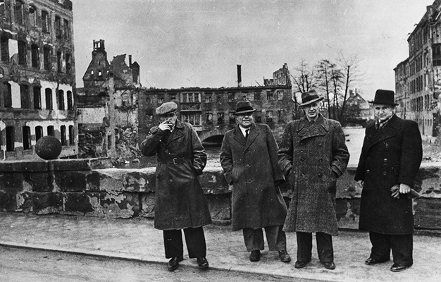 Ил. 2. Роман Кармен (второй справа), Всеволод Вишневский (второй слева) и другие советские корреспонденты в свободное время изучают развалины Нюрнберга. 1945–1946 годы. Источник: РГАЛИ. Ф. 2989. Оп. 1. Д. 870. Л. 2