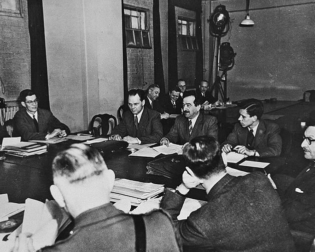 Ил. 7. Иона Никитченко, Арон Трайнин и Олег Трояновский (в центре, слева направо) во время прений на Лондонской конференции. Июнь 1945 года. Источник: Американский мемориальный музей Холокоста. Фотограф: Чарльз Александр. Предоставлено библиотекой Гарри С. Трумэна