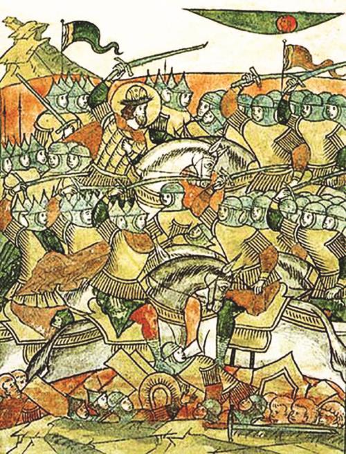 «Князь Александр Невский в битве на Чудском озере». Миниатюра из «Лицевого летописного свода»
