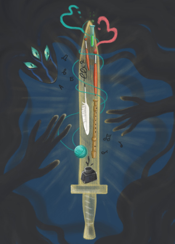Ничего не ответил ей Младший сын, только руки в стороны раскинул и спрыгнул с утёса. Падает, но чувствует, что не камнем летит, а будто пушинка парит – ясно, что не разобьётся. Долго падал, аж уснул, а как проснулся – понял, что лежит на траве. Пошевелился – вроде живой и целый. Осмотрелся – рядом меч лежит. То был Меч Творчества.