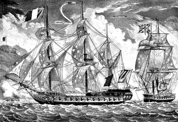 Бой британского брига «Пеликан» с французским фрегатом «Медея». Худ. В. Эльмс и Дж. Фэйрберн. Литография, 1797 г.