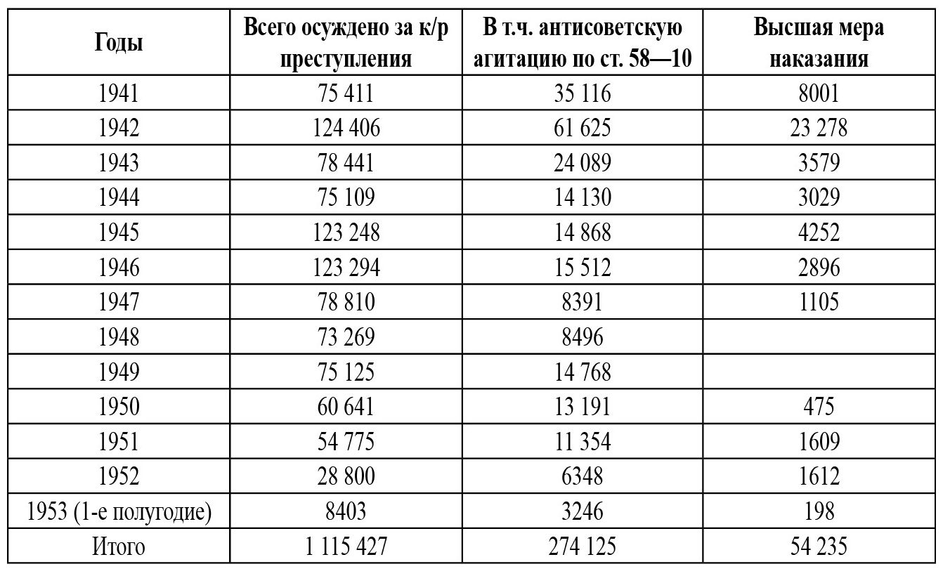 Из общего числа 1 115 427 осужденных за контрреволюционные преступления в период 1939-й – первая половина 1953 г. на годы Великой Отечественной войны приходятся 476 617 осужденных[62].