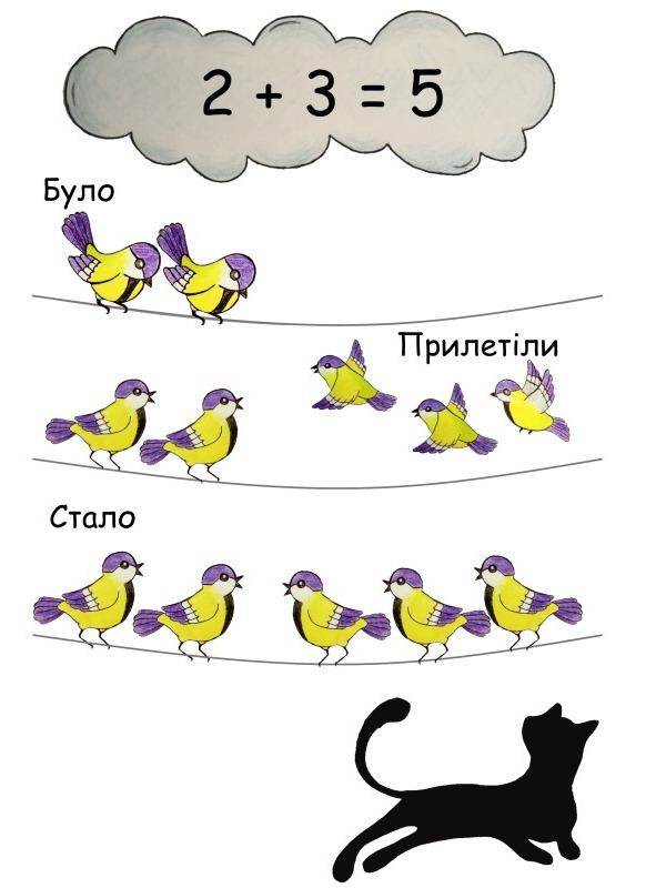 Наприклад, на мотузці сидить 2 пташки, ще 3 пташки прилетіли. Тепер на мотузці сидить 5 пташок.
