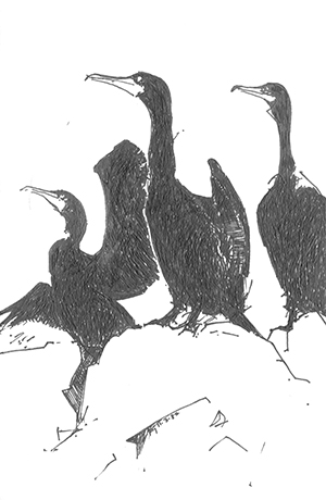 Cormoranes, dibujo a tinta, Pat de Groot, 3 de noviembre de 1982.