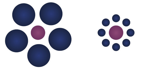 Увы, одними вышеперечисленными заблуждениями дело не ограничивается: мозг сам нередко вредит нашей объективности и рациональному принятию решений. Чтобы объяснить природу когнитивных искажений, я приведу всем знакомый пример оптической иллюзии. На рис. 2.1 оба фиолетовых круга в центре одинаковые, но из-за размера кружков по соседству кажется, будто левый круг меньше правого. По схожему принципу устроены и когнитивные искажения, они же «когнитивные иллюзии», – мыслительные модели, влияющие на наши решения и суждения. Как и в случае с обманом зрения, их крайне тяжело избежать, даже если знаешь о них.