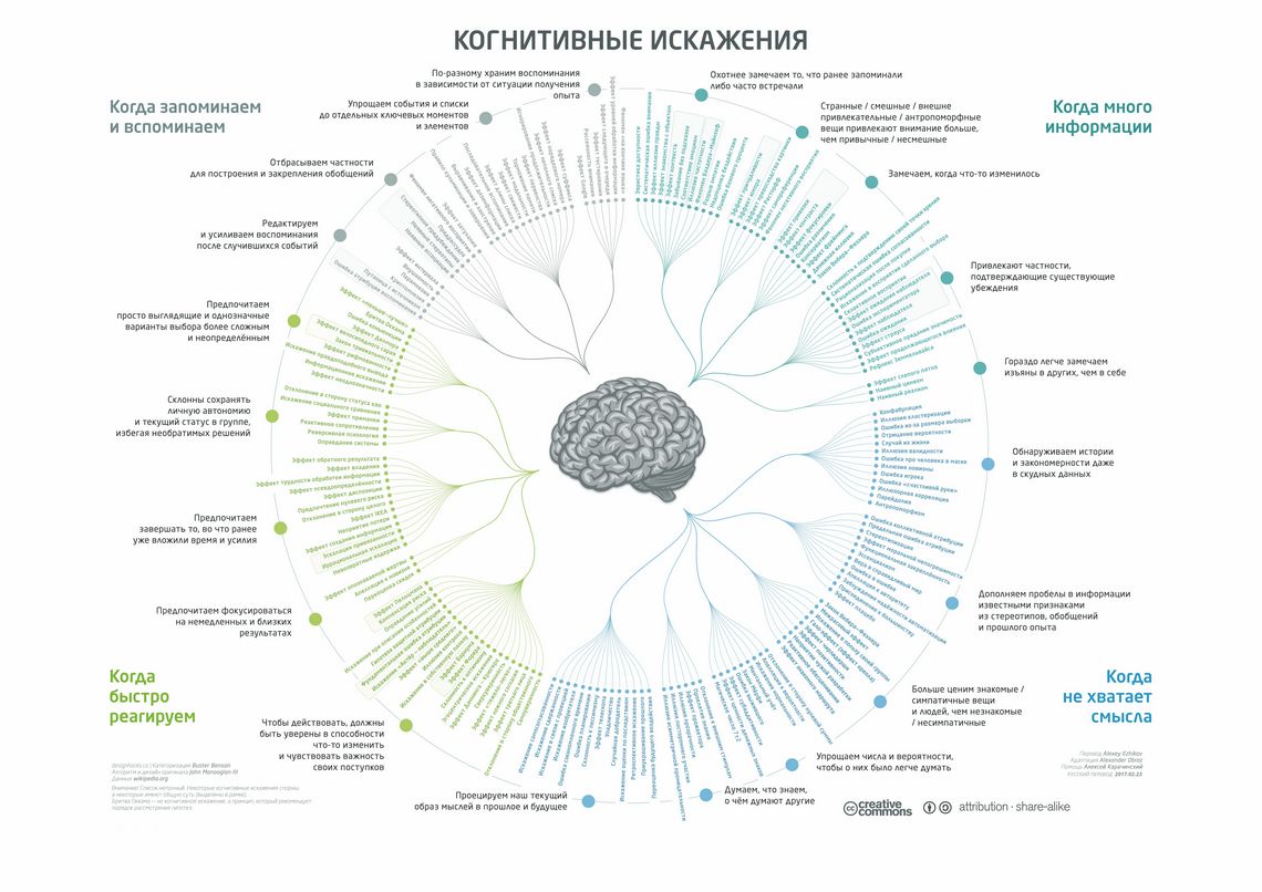 Рис. 2.2. «Кодекс когнитивных искажений», придуманный Бастером Бенсоном и оформленный Джоном Манугианом III (взято с сайта Designhacks.co Джона Манугиана III и Бастера Бенсона; публикуется с разрешения авторов). Перевод Alexey Ezhikov. Адаптация Alexander Obraz. Помощь Алексей Карачинский. Русский перевод 2017.02.23