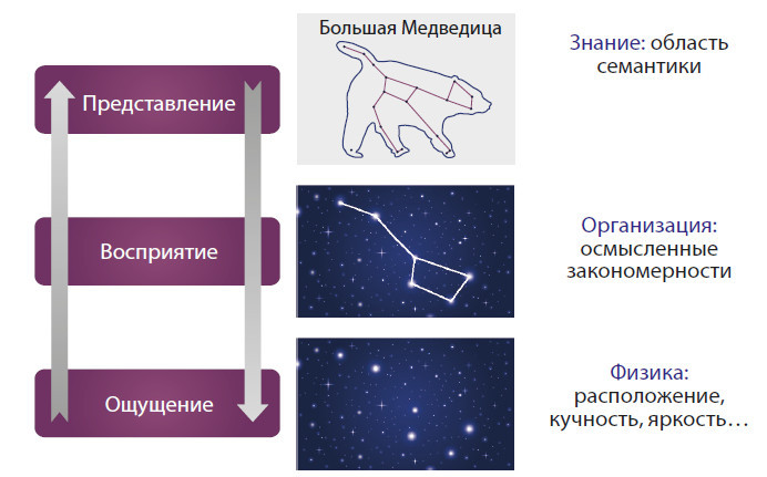 В качестве примера мы рассмотрим зрение, но все сказанное будет верно и для других органов чувств. Когда вы ночью любуетесь на чистое звездное небо, все сенсорные стимулы касаются физики: расположение звезд, их кучность, яркость и так далее. Затем мозг обрабатывает сенсорные сигналы, и вот этот процесс уже называется восприятием (см. рис. 3.1). Так, наблюдатель группирует самые яркие звезды в осмысленную для себя фигуру (скажем, ковш). Мозг – это мощное устройство по распознаванию образов, что позволяет нам быстро создавать мысленные слепки окружающего мира и находить их повторения в других объектах, иногда ошибочно. Последний шаг обработки информации лежит в области семантики[12] и представлений. Зная, какое созвездие имеет форму ковша, мы понимаем, что видим перед собой Большую Медведицу. Значит, информация достигла нашего сознания.