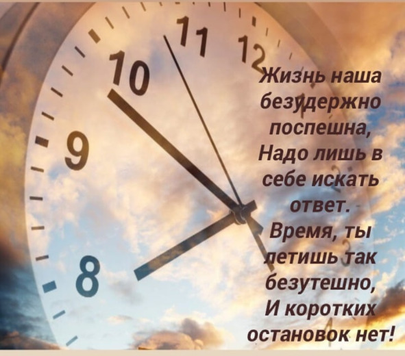 Время убегает быстротечно,Кто и для чего мы на земле?Сами задаем вопрос извечный,Только лишь ответа нет нигде. Время улетает словно ветер, Холод оставляя на душе.Если долгожданный этот вечер,Ляжет одиночеством уже. Время нас меняет неизбежно, Но не бойтесь говорить «люблю». Тем, кто так нам дорог бесконечно, Ведь стоим на грани, на краю.Время нас не лечит, а считаетДни, что нам отмерены в судьбе.И людей хороших посылает, Чтобы разобрались мы в себе. Жизнь наша безудержно поспешна, Надо лишь в себе искать ответ.Время, ты летишь так безутешно, И коротких остановок нет!