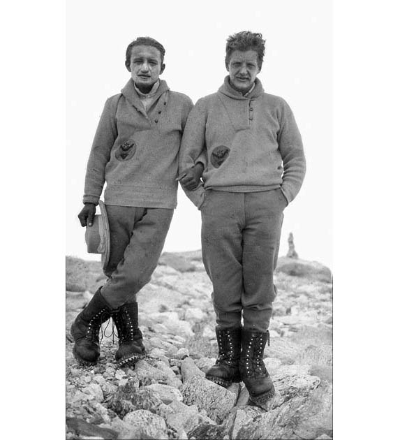 Im Basislager wurde Pallas’ und Erwins Erfolg mit einigen Runden Rum gefeiert. Die überglückliche Seilschaft plante sofort die Besteigung eines weiteren Gipfels, des Dodang Nyima (7150 m), der zwar etwas niedriger als der Jongsong Peak war, dafür aber technisch schwieriger.45 Nach zwei Tagen Erholung von der Besteigung des Jongsong Peak brachen sie zum Dodang auf und untermauerten damit ihren Ruf als „unersättliches“46 Paar mit „unerschöpflicher Energie“.47 Abermals kamen ihnen ihre ergänzenden Fähigkeiten zugute und ihre unterschiedlichen Stile hielten sich die Waage: Erwins Impulsivität und Beweglichkeit mit Hoerlins Bedächtigkeit und Beständigkeit. An einem kritischen Punkt, der Überkletterung eines schwierigen Überhangs, bemerkte Erwin „zu [des] Freundes seelischer Beruhigung“: „Pass auf, Pallas, gleich werde ich fliegen!“48 Der Moment der Anspannung ging vorüber, mein Vater hielt fest das Seil, mit dem er seinen Partner sicherte. Schneider „flog“ nicht, doch sowohl beim Auf- wie auch beim Abstieg wurden beide nur knapp von etlichen Lawinen verfehlt. Mit typischer Bescheidenheit, die niemandem etwas vormachte, spielte die erschöpfte Seilschaft nach der Rückkehr ins Basislager die Gefahr herunter und berichtete der versammelten Mannschaft von ihrem Erfolg. Mit Tee und Keksen wurden die beiden Bergsteiger gefeiert.
