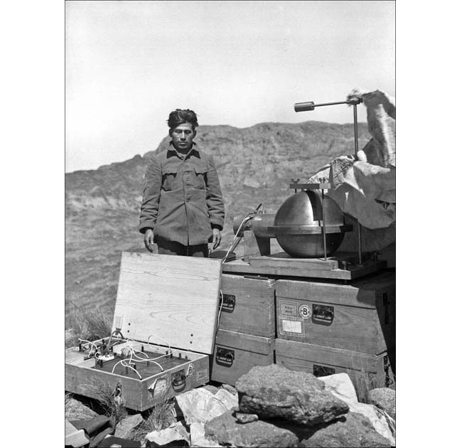 Nestor Montez mit Hoerlins Geräten zur Messung der kosmischen Strahlung