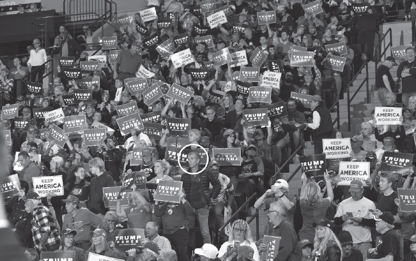 As the afternoon wore on, fans trickled in, greeted each other with hugs and high fives, and claimed their grub stake with cheap, folding chairs, to be carried along as the line shifted and then abandoned when the rush for the door came. Rich Hardings’s life-size cardboard cutout of Trump went up. People really dug that, liked to have their picture taken with “him.” A Black man arrived in a red, white, and blue Stars and Stripes baseball shirt, and no one commented—African Americans were not just welcome at Trump rallies but encouraged. If you weren’t thinking too hard about it you might see the occasional Black face and think, huh, this is a surprisingly multiracial, heterogeneous crowd. This would be ridiculous, since even a huge Black turnout at a rally might be a hundred in a sea of twenty-two thousand.