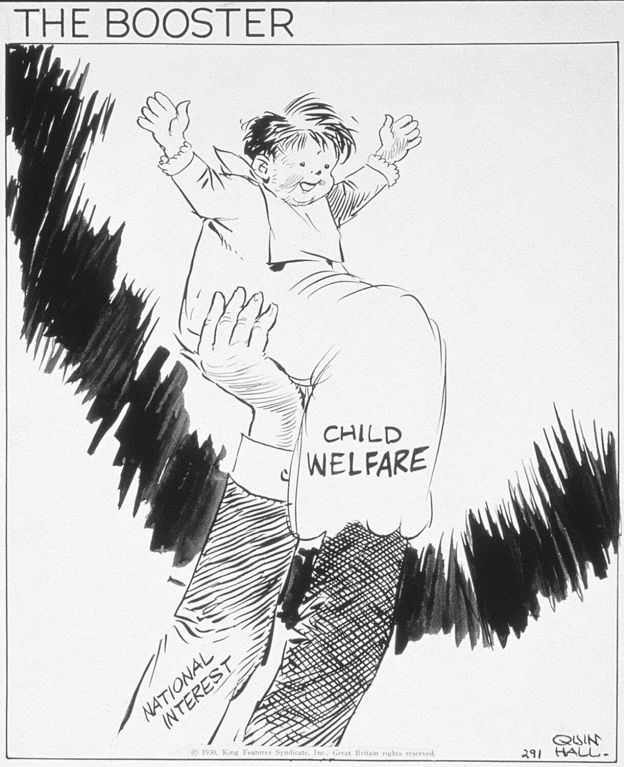 Ил. 1. Британский социальный плакат, 1930. Руки с надписью «Национальный интерес» поднимают вверх ребенка, на котором написано «Социальная помощь детям» (Плакат UK 1543. Poster Collection, Hoover Institution Archives)