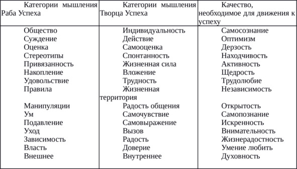 Для удобства сопоставительного анализа категорий мышления, которыми пользуются Творцы Успеха с категориями мышления Рабов Успеха, мы сведем их в одну таблицу. В первом столбике будет представлена категория мышления, которой пользуются Рабы Успеха, а во втором столбике – категория мышления, свойственная Творцам. В третий столбик я помещу качество, которое можно выработать стремящемуся стать Творцом Успеха, если он будет постоянно отслеживать и вычищать из своего мышления рабские категории мышления, двигаясь к их замещению на категории творческие. В противном случае, придется либо мириться со своей неуспешностью, либо смириться с положением раба – то есть, в конечном итоге, все равно остаться неуспешным.