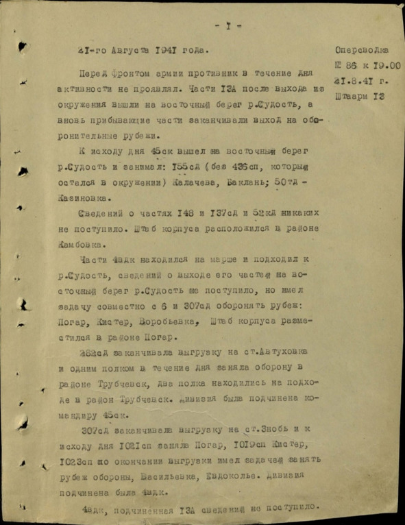 В тесном взаимодействии с соседями Дивизия ведет активную оборону до 26.9.41 г. После выполнения задачи /выхода на восточный берег реки СУДОСТЬ/ 3 Армия произвела перегруппировку сил и снова была занята оборона.