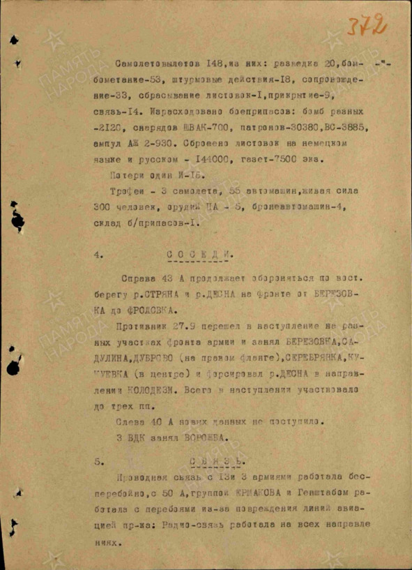 За 26 сентября уничтожено 98 немецких самолётов. Наши потери – 31 самолёт. Наши суда Северного флота потопили два транспорта противника водоизмещением в 8 тысяч и 5 тысяч тонн.