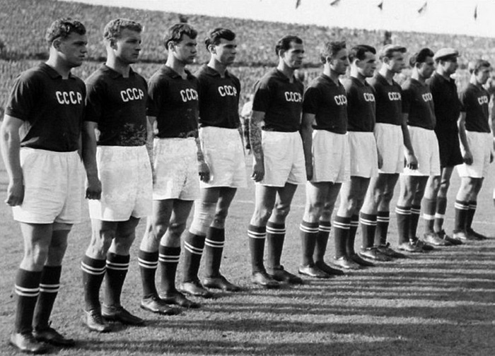 Сборная команды СССР по футболу (в спортивной форме слева направо):Альберт Шостерев, Лев Яшин, Валерий Воронин, Эдуард Стрельцов, Александр Ленев, Валентин Афонин, Иосиф Сабо, Анатолий Бышовец, Федор Медвидь, Василий Данилов и Игорь Численко