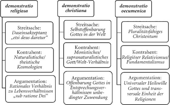 Zur Debatte steht zunächst mit der Streitsache Gott die Verantwortbarkeit einer Rede von Gott, für die angesichts einer Gott los gewordenen Moderne weder eine klare Anschlussfähigkeit für innerweltliche Notwendigkeiten noch für Weltentstehungsreflexionen besteht. Darauf folgt die Streitsache Offenbarung, die nicht nur formal den Geltungsanspruch des Christentums anhand der Leitkategorien „Verhältnis“ und „Relation“ darlegt, sondern auch materialiter Auskunft über die Kernbotschaft des Christentums von der Selbstvergegenwärtigung Gottes als Ereignis unbedingter Zuwendung in den Lebensverhältnissen des Menschen gibt – und dies angesichts einer kategorisch bestrittenen Möglichkeit der Präsenz des Unbedingten im Bedingten. In der Streitsache Heilswege geht es nicht nur um die Frage, inwieweit die christlichen Konfessionen Ort und Ereignis des Heilswillens Gottes sein können. Hier ist vielmehr zu erörtern, inwieweit die Universalität dieses Heilswillens aus christlicher Sicht auch andere Religionen als Ort und Ereignis seiner Antreffbarkeit zu denken erlaubt, selbst wenn diese Antreffbarkeit von gänzlich anderer Art sein mag, als sie das Christentum von sich bezeugt. Auf diese Weise lassen sich für die konkrete Begegnung der Religionen wie für die theologische Reflexion des interreligiösen Dialoges neue (transversale) Beziehungsmuster entdecken. Somit wird der Themenkomplex einer Theologie der Religionen in ein fundamentaltheologisches Curriculum inseriert und umgekehrt die „quaestio catholica vel oecumenica“ in einen größeren Kontext gestellt.