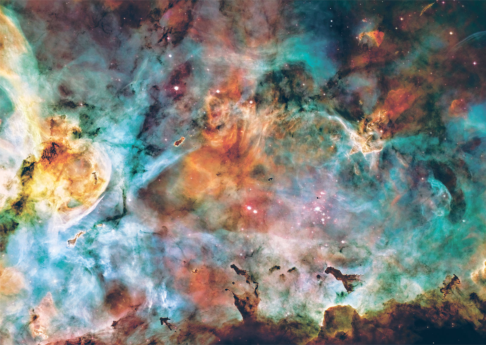 На фотографии – изображение туманности η Киля, охватывающее область размером 50 световых лет. Составлено из 48 фотографий, полученных в 2005 году космическим телескопом «Хаббл». Туманность η Киля – огромное облако газа и пыли, в недрах которого есть и области формирования звёзд, и молодые горячие звёзды, и уже умирающие звёзды. Цветом выделено излучение некоторых химических элементов: серы (красный), водорода (зелёный) и кислорода (синий).