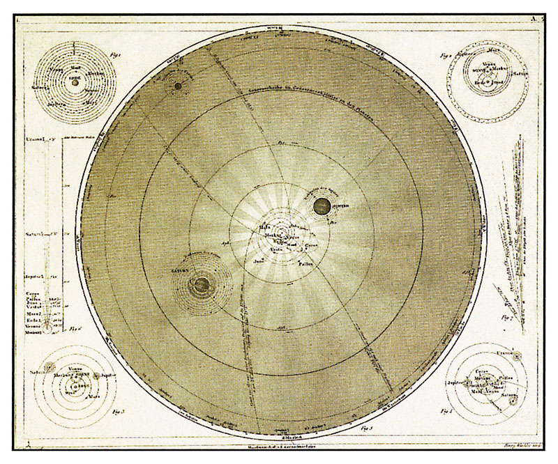 Старинный рисунок, на котором изображены разные космологические модели, объяснявшие движение планет. На центральной схеме представлена гелиоцентрическая (в центре находится Солнце) модель движения шести известных в то время планет, их спутников и других небесных тел, обращающихся вокруг Солнца. Со второго века доминирующей моделью стала геоцентрическая (в центре находится Земля) система Птолемея (вверху слева). На смену ей пришла гелиоцентрическая система Коперника, опубликованная в 1543 г. (внизу справа). В египетской модели (внизу слева) и модели Тихо Браге (вверху справа) предпринимались попытки сохранить представление о неподвижной Земле как центре Вселенной. Подробные сведения об орбитах планет приведены слева и справа.