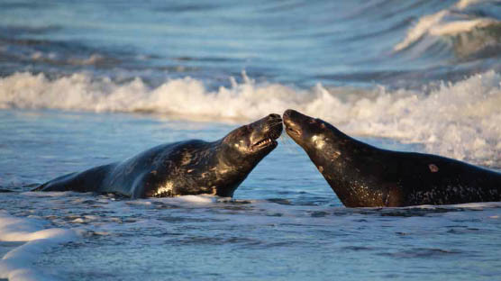 Die Windböen sind so stark, dass sie periodisch einen kniehohen Sandsturm auf dem Strand aufwirbeln. Das Fell der Kegelrobben sieht aus wie ein paniertes Wiener Schnitzel, bis sie sich wenden und die Augen öffnen. Nebenan hat eine Mutter vor kurzem ein Junges geboren und leckt nun sein weißes Fell. Ein paar Meter entfernt kämpfen zwei dicke Kegelrobbenbullen um ihr Revier, den Hals voller Bisswunden, aber immer noch stark und unnachgiebig, bis einer der Rivalen nachgibt und zurück ins Wasser rollt.