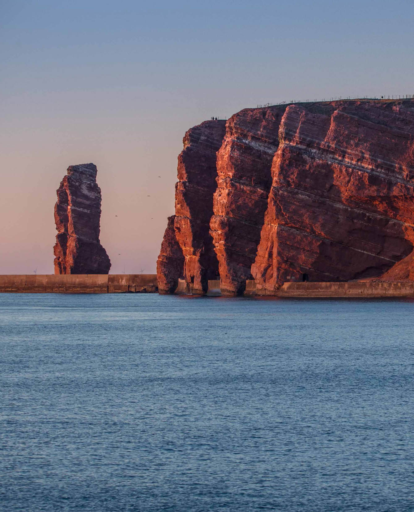 Dichter und Denker früherer Zeiten bezeichneten Helgoland gern als »Capri des Nordens«. Das lässt mediterrane Anklänge vermuten. Schon die Fährfahrt zu Deutschlands einziger Hochseeinsel kann ein kleines Abenteuer werden. Das Fahrwasser führt zunächst durch das Wattenmeer vorbei an dicken Pötten und Arbeitsschiffen, welche die Elbe anlaufen. Weiter draußen wartet nicht selten ein ordentlicher Wellengang. An der Reling stehend, kann man so die Kraft des Meeres spüren. Wenn dann die Felsentürme der Hauptinsel in Sicht kommen, ist man gleich vom Charme Helgolands gefangen.