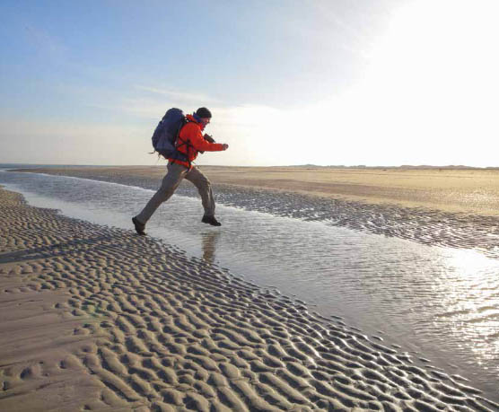 Hier kann man sich auf beinahe endlosen Strandspaziergängen den Wind um die Nase wehen lassen und an einsamen, wilden Stellen schwimmen gehen. Im Sommer kann das kleine Randmeer seine Besucher mit Wasserfarben in Karibiktönen und lauem Badewetter verwöhnen. In der Nebensaison toben sich hier die Tiefdruckgebiete aus, und das nun graue Wasser der Nordsee hämmert mit beeindruckenden Wellen auf das Ufer. Ideales Terrain für Zeitgenossen, die beim »Stormwatching« die Kraft der Natur hautnah am eigenen Leib erfahren wollen.