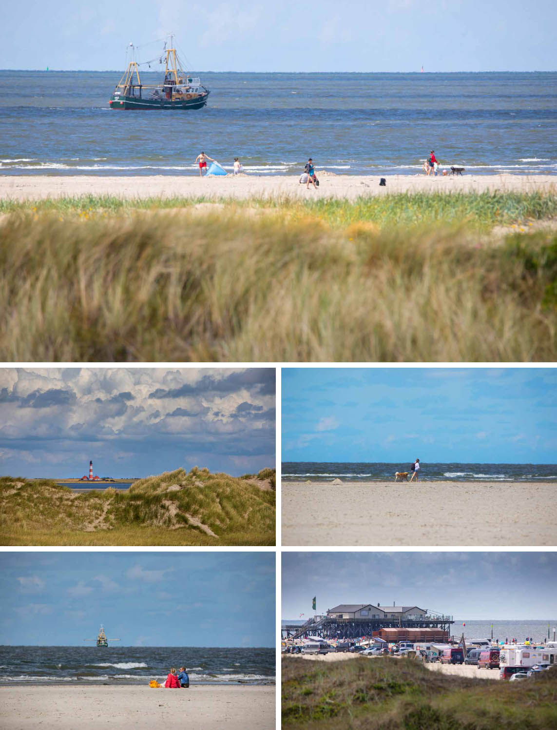 Dieser Strand ist wohl der bekannteste Strand Deutschlands. Wer am riesigen Strandparkplatz ankommt, blickt in der Saison auf Hunderte Autos und Wohnmobile und ein wahres Gewusel aus sonnenhungrigen Strandbesuchern. Trotz des Trubels lassen sich hier Orte für ruhige Stranderlebnisse entdecken. Dazu muss man gute 2 Kilometer am Strand entlang nach Norden laufen und passiert dabei den FKK- und den Hundebereich. Schnell bemerkt man, wie die Zahl der Besucher mit jedem Schritt abnimmt. Die Wasserqualität ist hoch, aber das Wasser ist wie überall hier aufgrund der nahen Wattenmeerflächen leicht trübe. Der Sand ist ausgesprochen fein und fest, und man muss ein paar Meter über flachen Sandboden ins Wasser waten, um ganz eintauchen zu können. Streckenschwimmer daher bitte aufgepasst: So mancher Fischkutter kommt dem Ufer recht nahe. Je nach Wind kommt es auch hier zu starker Brandung und Rippströmungen. Bei stärkeren Winden fällt auch das Hochwasser höher aus und kann den Strand gänzlich überschwemmen. Wer gern spazieren geht, kann noch ein ganzes Stück weiter in Richtung Westerhever Leuchtturm wandern, der auf der anderen Seite der Bucht Tümlauer-Koog aufragt. Nachdem man sich den Wind hat um die Nase wehen lassen, kann man zum Beispiel im Strandcafé »Silbermöwe« seine verbrannten Kalorien wieder auffüllen bzw. sich zurückholen.