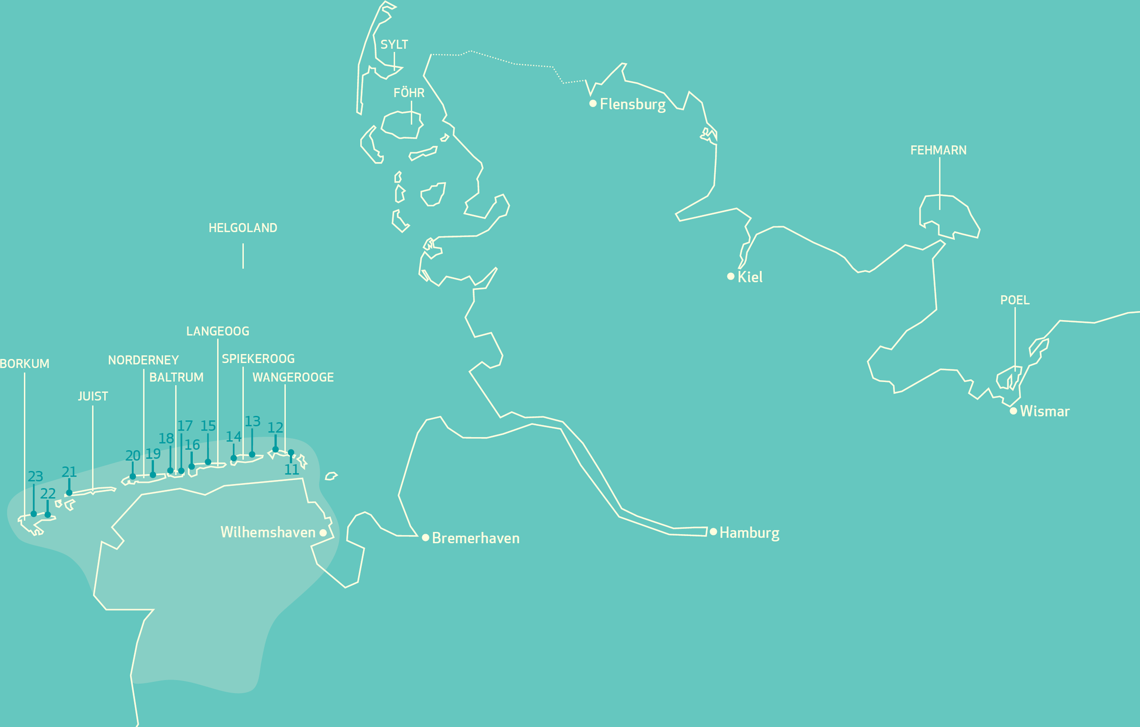 Niedersachsens Küste wird von einer Perlenkette aus Sandinseln geschützt. Die vorgelagerten Eilande befinden etwa 3 bis 15 Kilometer weit draußen auf der Nordsee. Dazwischen erstreckt sich das niedersächsische Wattenmeer, dass ebenso wie Teile der Inseln zum gleichnamigen Nationalpark gehört. Typisch für alle Inseln ist, dass ihre Außenseite von einem Saum aus Sand eingefasst wird. An den Spitzen der Inseln befinden sich oftmals Naturschutzgebiete, die nicht oder nur ufernah am Spülsaum betreten werden dürfen.