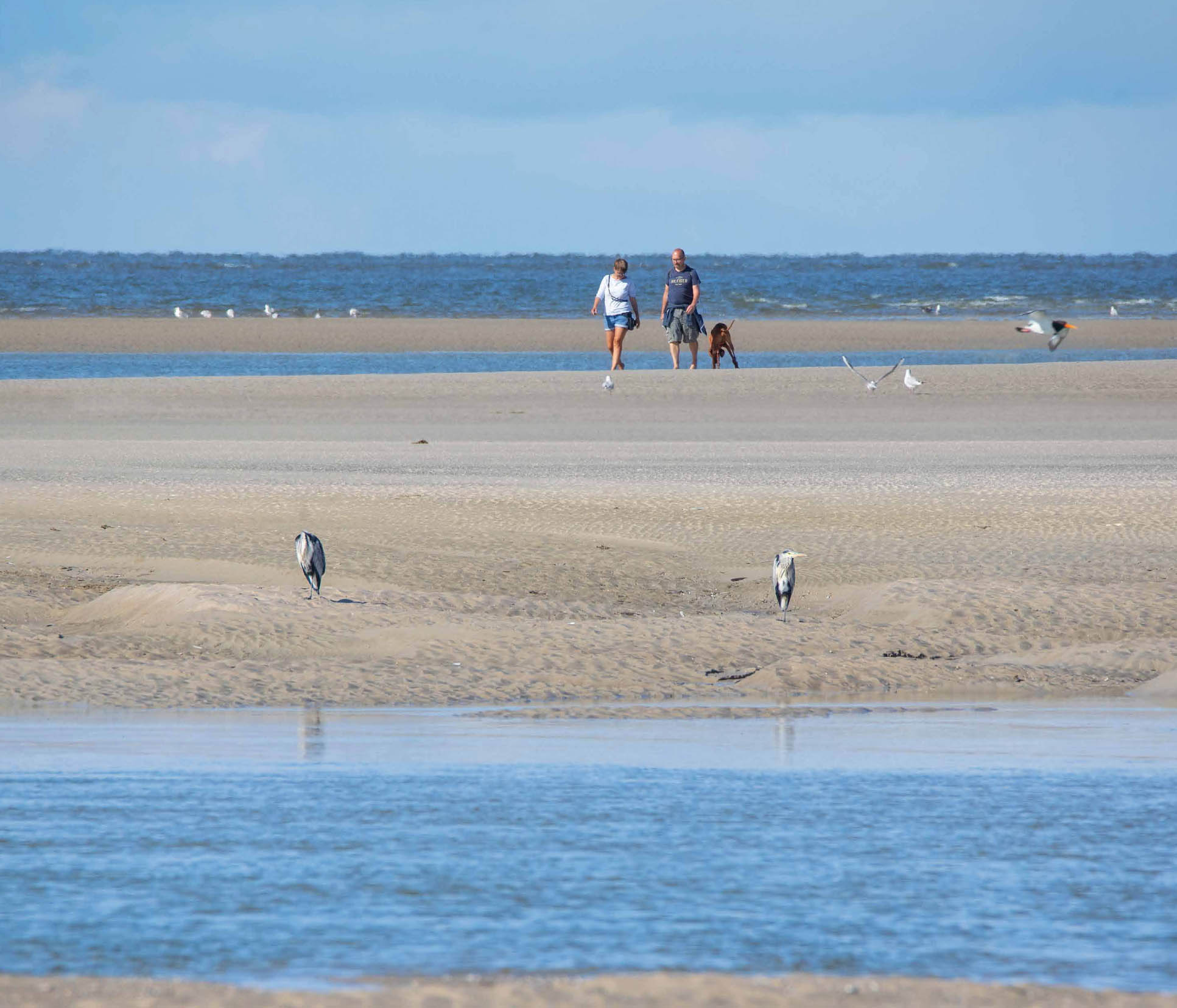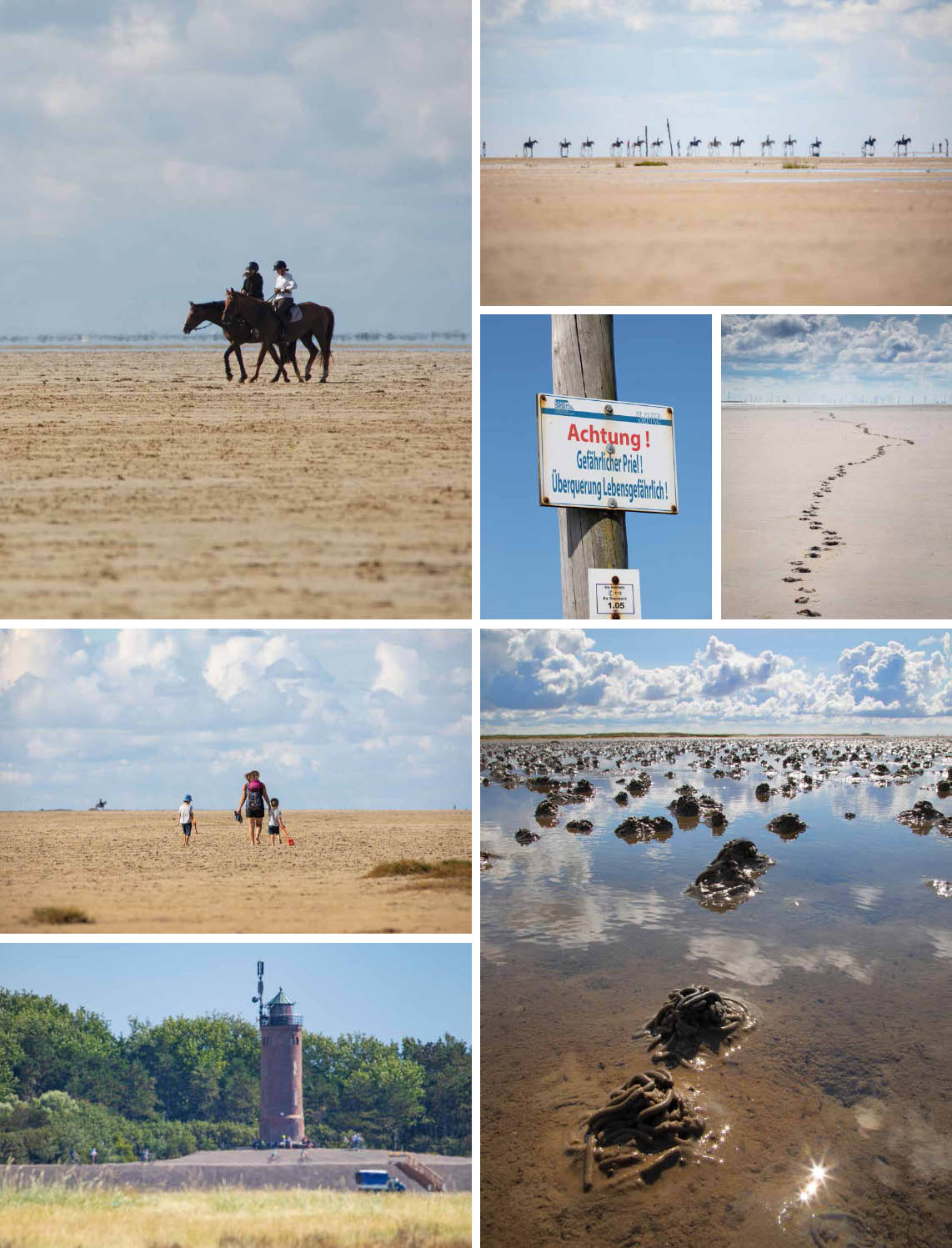 Wer Glück hat, sieht Wolken von Alpenstrandläufern über den Horizont rauschen. Möwen patrouillieren an Rändern von kleinen Tümpeln oder am Spülsaum der Nordsee auf der Suche nach dem kleinen Leckerbissen. Vor lauter Euphorie sollte man die Tiden nicht außer Acht lassen, um sicher zurückzugelangen. Ist es windig und wellig, ist ein Baden hier nicht anzuraten.