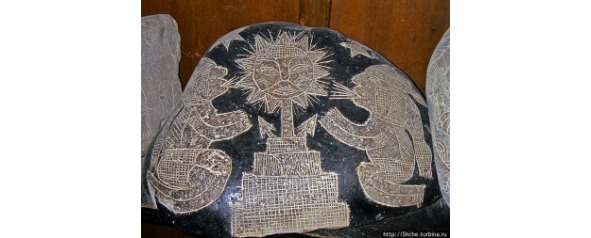 Но на мой взгляд самые интересные камни те, где эти великаны разговаривают со своим Богом. Он похож на Солнце с человеческим лицом (так же рисовали бога славяне на своих щитах), находящимся на вершине пирамиды. Это такой Бог (тувалу) с которым можно пообщаться, а не просто помолиться на стену с его изображением или в сторону Мекки.