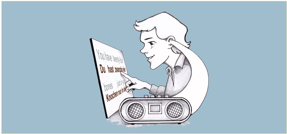 Die Lernenden haben die Dekodierung vor sich. Sie hören den Text in der Zielsprache und lesen gleichzeitig die Zeile in ihrer Muttersprache, in unserem Fall also die deutschsprachige Zeile. So können die Lernenden den Klang der Wörter mit deren Bedeutung verbinden. Einziges Ziel dieses Lernschrittes ist das Verstehen des Textes auch ohne Dekodierung. Um dies zu erreichen, hören die Lernenden den Text mehrmals. Am Ende dieses Lernschrittes macht es für sie keinen Unterschied mehr, ob der Text in der Zielsprache oder in der Muttersprache gehört wird. Beides wird gleich gut verstanden.