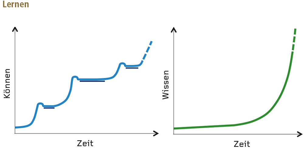 Die Lernkurve des Könnens unterscheidet sich von jener des Wissens maßgeblich. Beim Zuwachs von Können haben wir jeweils einen steilen Anstieg, dann einen kleinen Abfall und schließlich eine längere Plateau-Phase. Georg Leonard rät uns, das Plateau – also genau die Phase, in der wir den Eindruck haben, dass es nicht weitergeht und dass das Lernen stillzustehen scheint – zu lieben (Leonard 2006, S. 47). Eines Tages wird kontinuierliches Training mit einem weiteren steilen Anstieg belohnt.