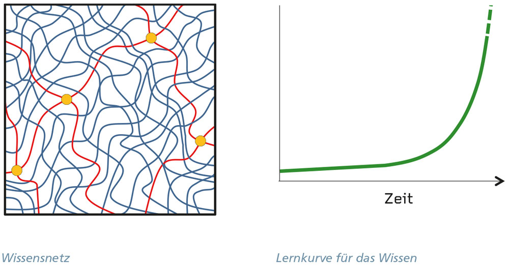 Deshalb ist der Lernkurvenverlauf hier exponentiell. Zu Beginn (dort, wo die Kurve noch flach ist) ist das Lernen ganz neuer Inhalte noch schwer, denn Sie haben erst wenige Fäden zum Thema in Ihrem Wissensnetz. Je mehr Sie aber zum Thema wissen, desto leichter fällt es Ihnen, an das bestehende Wissen anzuknüpfen. Länger an einem Thema dranzubleiben, lässt die Lernenden erfahren, dass eben nur der Anfang schwer ist und das Lernen schon bald leichter wird!