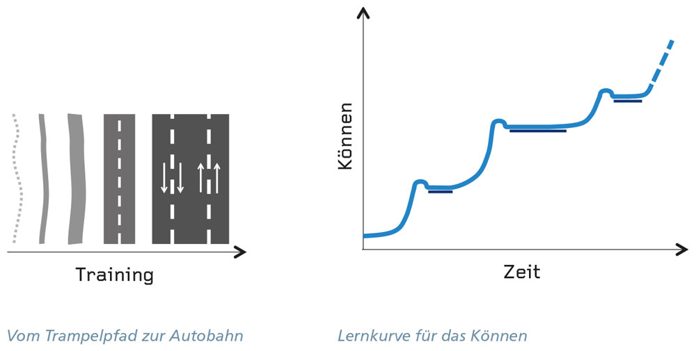 Die Plateauphasen und die steilen Anstiege wechseln sich immer wieder ab. Mal sind die Kurven steiler – manchmal sind die Plateaus länger – dies verändert sich immer etwas. Wichtig ist: Sie müssen auch in der Plateau-Phase weiter trainieren, um den Lernreiz aufrechtzuerhalten und dadurch einen neuen steilen Anstieg zu erreichen. Wenn nicht mehr geübt wird, wachsen die Pfade bald wieder zu. Das Gehirn funktioniert nach dem bekannten Prinzip: »Use it or lose it.« Jeder und jede wird hierzu passende Beispiele aus dem eigenen Erfahrungsschatz beisteuern können.