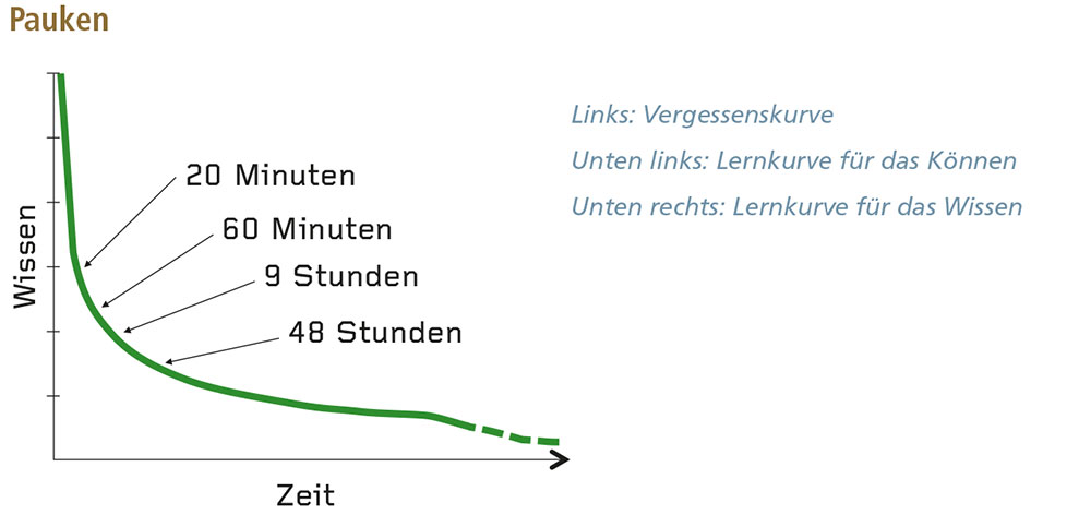 Pauken wir, mögen Inhalte zwar kurzfristig abrufbar sein. Die Kurve zeigt aber, dass wir den größten Teil schon bald wieder vergessen. Lernen wir jedoch nachhaltig, dann bauen wir laufend auf dem Gelernten auf (kumulierendes Lernen) und die Kurve verläuft nach oben, was auf Nachhaltigkeit und damit auch echte Kompetenz hindeutet. Remo Largo, Kinderarzt und über lange Jahre Leiter der Abteilung Wachstum und Entwicklung des Universitäts-Kinderspitals Zürich, schreibt: