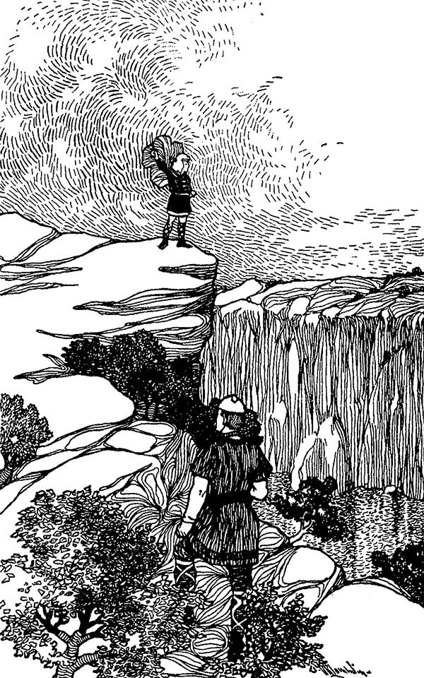 Много лет назад Эгир был великим воином. Его называли Эгир Большие руки. Его меч побывал во многих сражениях, и не счесть, сколько воинов он отправил в Валгаллу. Мечи других мужчин задевали его плоть и оставили на ней шрамы, но ни один из них не нанес ему смертельную рану. Его волосы побелели, руки стали тонкими и слабыми. В стране был мир, и Эгир с сожалением сказал: «Я стар. Сражений нет. Неужели я должен умереть в постели, как женщина? Неужели мне не суждено увидеть Валгаллу?» – Но Один когда-то постановил: «Если мужчина стар, чувствует близость смерти и не может умереть в бою, он должен принять смерть, совершив храбрый поступок, и тогда он будет пировать вместе со мной в Валгалле». И однажды Эгир пришел на эту скалу.