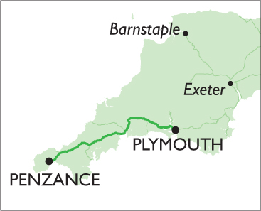 From Lostwithiel, the railway climbs away from the valley to pass through Treverran Tunnel before descending to Par station, junction for the Newquay branch line. Leaving Par behind, the line heads along the Carlyon Bay coastline before climbing inland to St Austell, Cornwall’s largest town and centre of the china clay industry. Westwards from here, the railway follows a switchback route to Truro, crossing steep-sided river valleys on 8 viaducts and boring through the hills in two tunnels. West of Truro (junction for Falmouth), it climbs steadily up through the hills to Redruth before descending to call at Camborne, Hayle and St Erth (junction for St Ives). The line then cuts across the Cornish peninsula to follow the shore of Mount’s Bay past Long Rock depot to reach Penzance station.