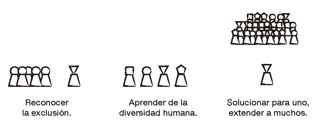 Los tres principios del diseño inclusivo: reconocer la inclusión; aprender de la diversidad humana, resolver para uno, extender a muchos.