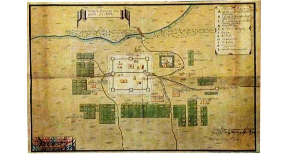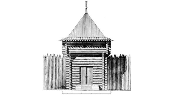 Острог был обрыт рвом и насыпью с надолбами в диаметре 25 саженей (то есть 54 метра), на которой стоял дубовый тын. Ниже на картинке показана примерная схема этого острога: