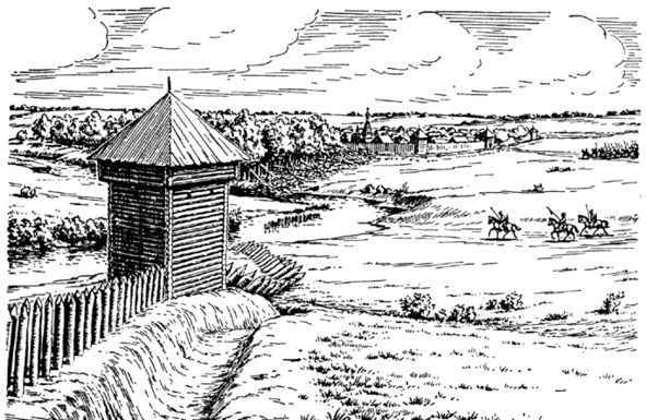 Оборонительный вал, со сторожевой башней, тыном и рвом