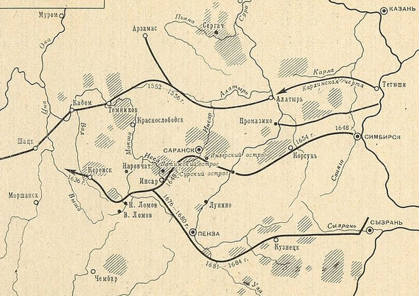 Схема пограничных сторожевых линий (оборонительных валов) в Среднем Поволжье в XVI – XVIII вв. (по Хохрякову В. Х.)