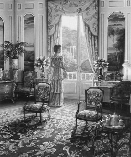 (Муж подходит к картине, нюхает все талоны на натюрморте, гладит их рукой.)