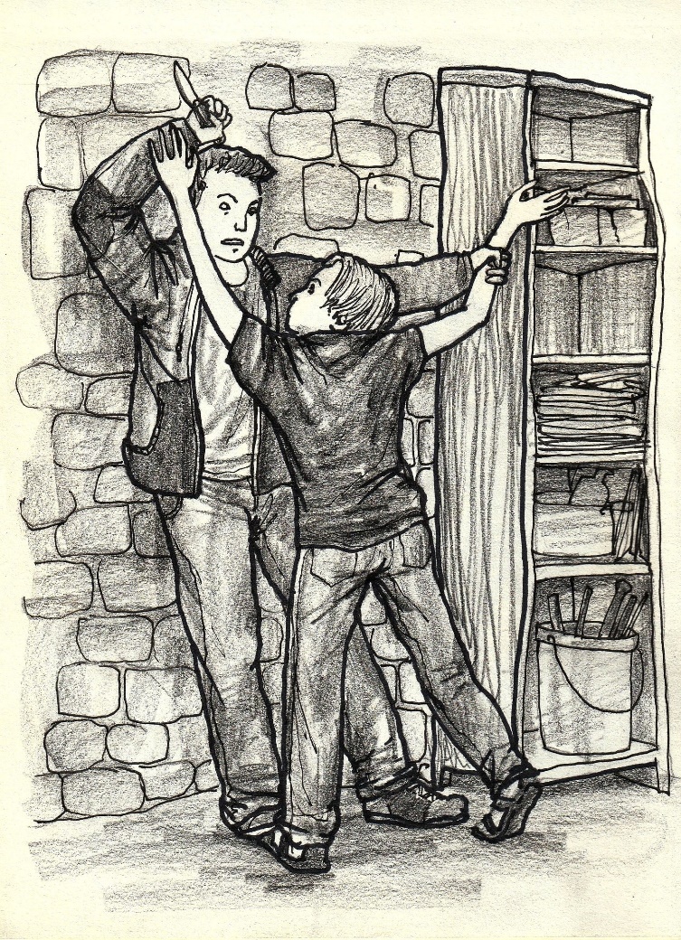 В этот момент Мишка прижал Колбасу к стене, и схватив за руку, начал ее выворачивать.