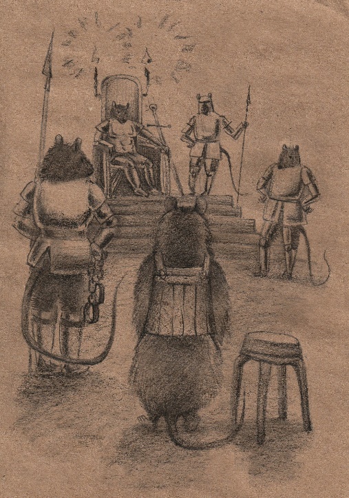 Все крысы опустились на одно колено и в это время в зал вошел, окруженный советниками и приближенными, сам Аподемус Великий. Он не спеша взгромоздился на трон, слегка поерзал, и наконец то уместившись, посмотрел на мышака. Данте ответил ему прямым взглядом и стал ждать, что будет дальше.