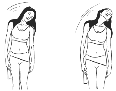 4. Стоя прямо, опустите голову вниз и выполните поочередные полукруговые движения головой вправо и влево. Сначала вниз, затем в сторону и влево-вверх, вниз, в сторону, вправо-вверх. Движения выполняйте плавно и мягко. Повторите упражнение на 30 счетов: 15 – влево, 15 – вправо.