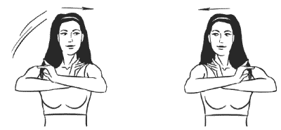 7. Из предыдущего упражнения, скрестите руки в области запястий (ладони – в восточном положении, средний и большой пальцы слегка приближены друг к другу), локти вниз не опускать. Продолжайте выполнять движения головой из стороны в сторону. Повторите упражнение на 30 счетов.
